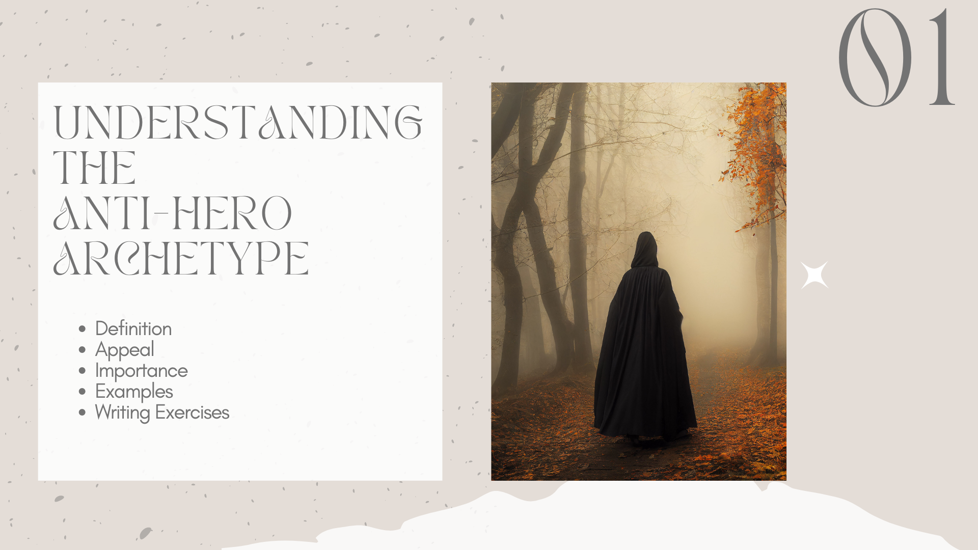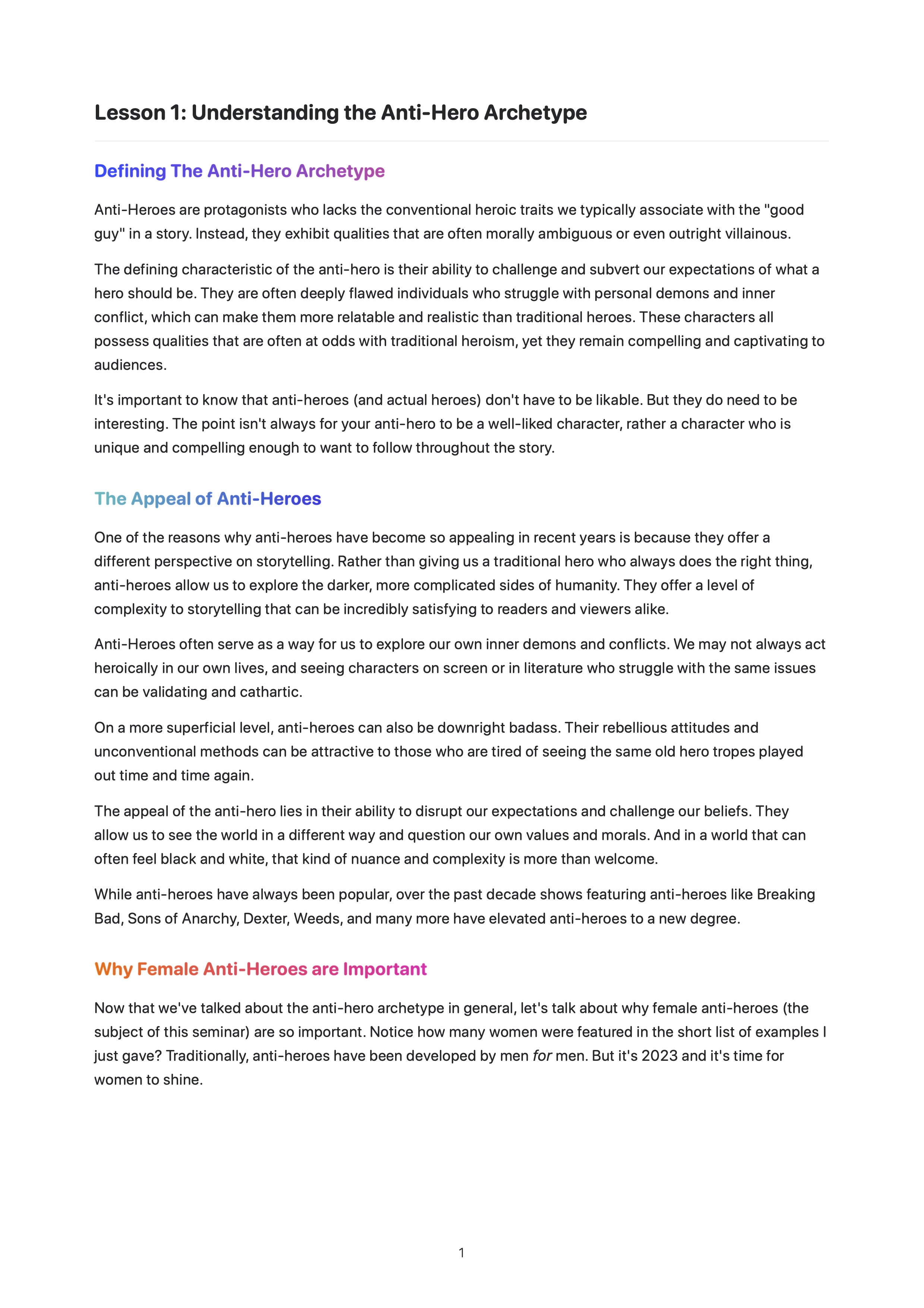lesson 1 Understanding the Anti-Hero Archetype In this lesson we'll dive into defining the anti-hero archetype, the appeal of anti-heroes, why female anti-heroes are important, and lastly we'll go through some examples of popular female anti-heroes. DOWNLOAD THE SLIDES DOWNLOAD THE HANDOUTS I have completed this lesson Next Lesson
