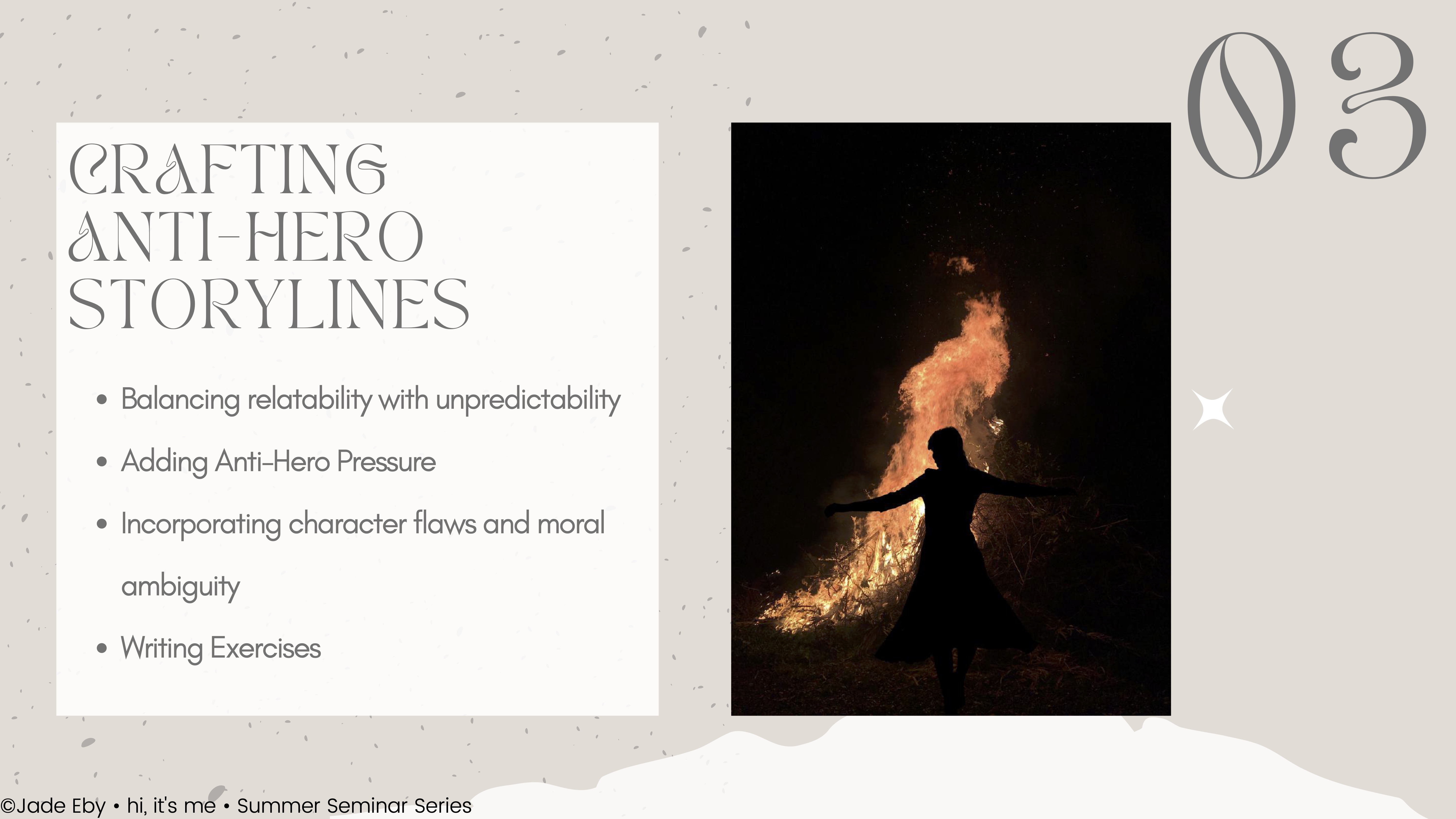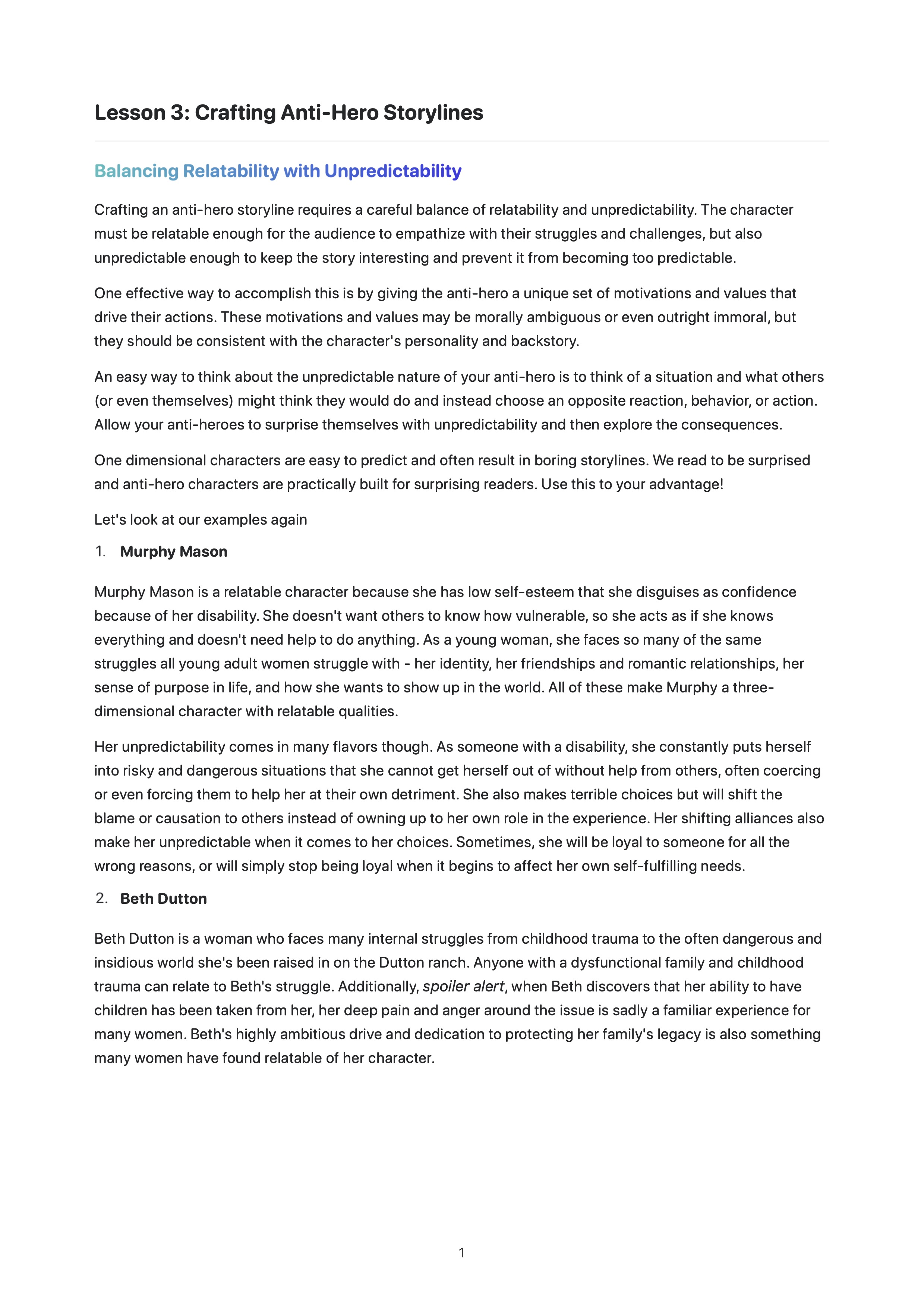 Lesson 3 Crafting Anti-Hero Storylines In this lesson, we'll talk about balancing relatability with unpredictability, incorporating character flaws and moral ambiguity. DOWNLOAD THE SLIDES DOWNLOAD THE HANDOUTS I have completed this lesson Next Lesson
