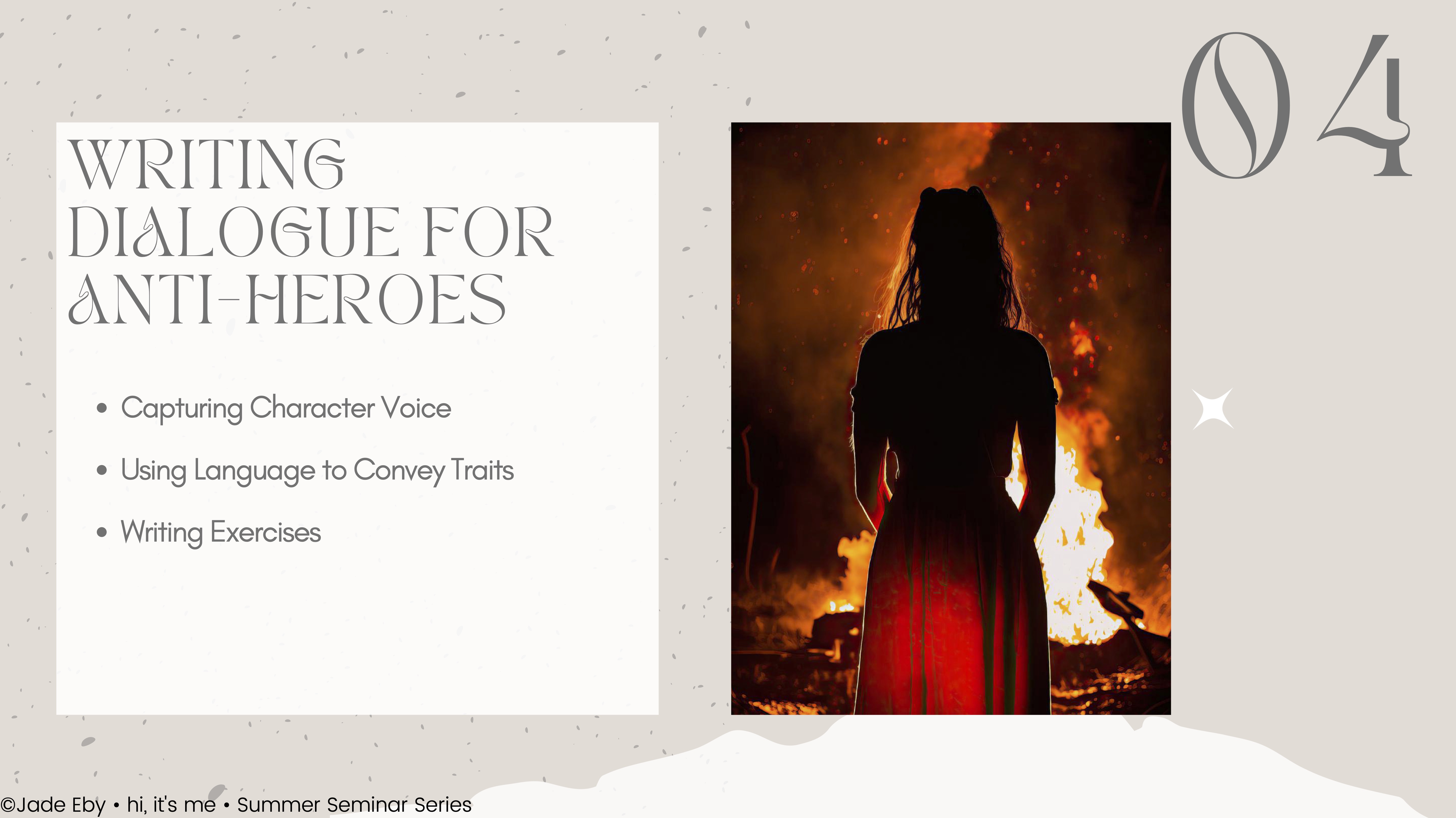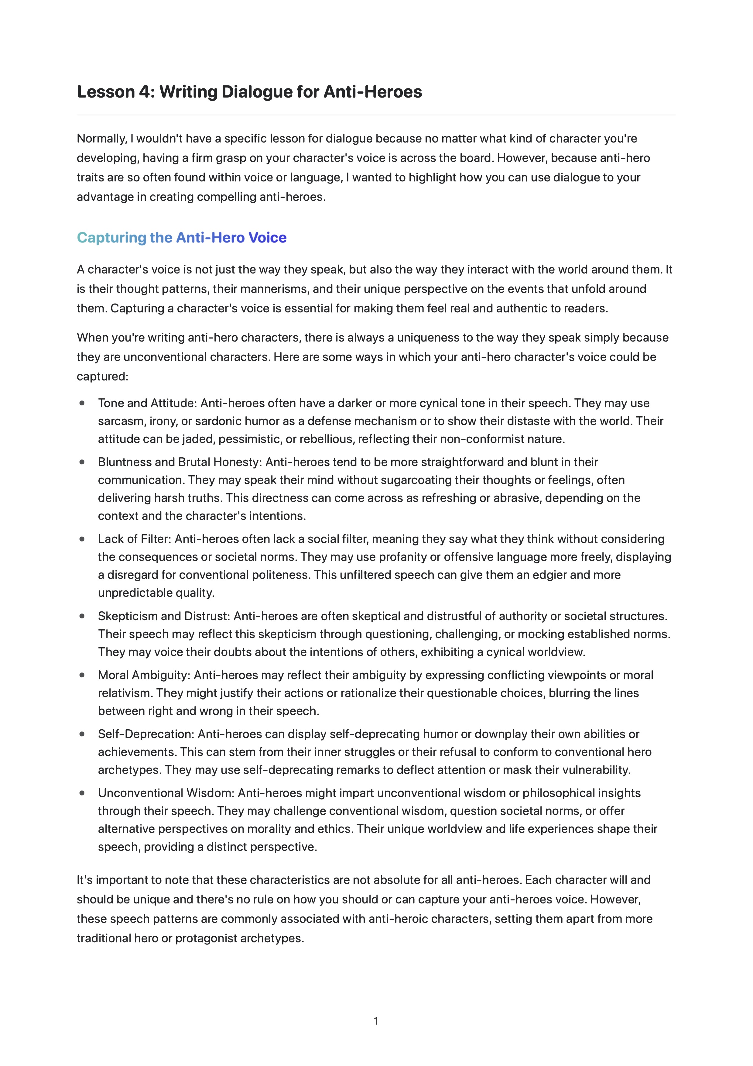 Lesson 4 Writing Dialogue for Anti-Heroes This lesson is all about how to capture your character's voice, language, and tone so your anti-hero comes alive off the page. DOWNLOAD THE SLIDES DOWNLOAD THE HANDOUTS I have completed this lesson Next Lesson