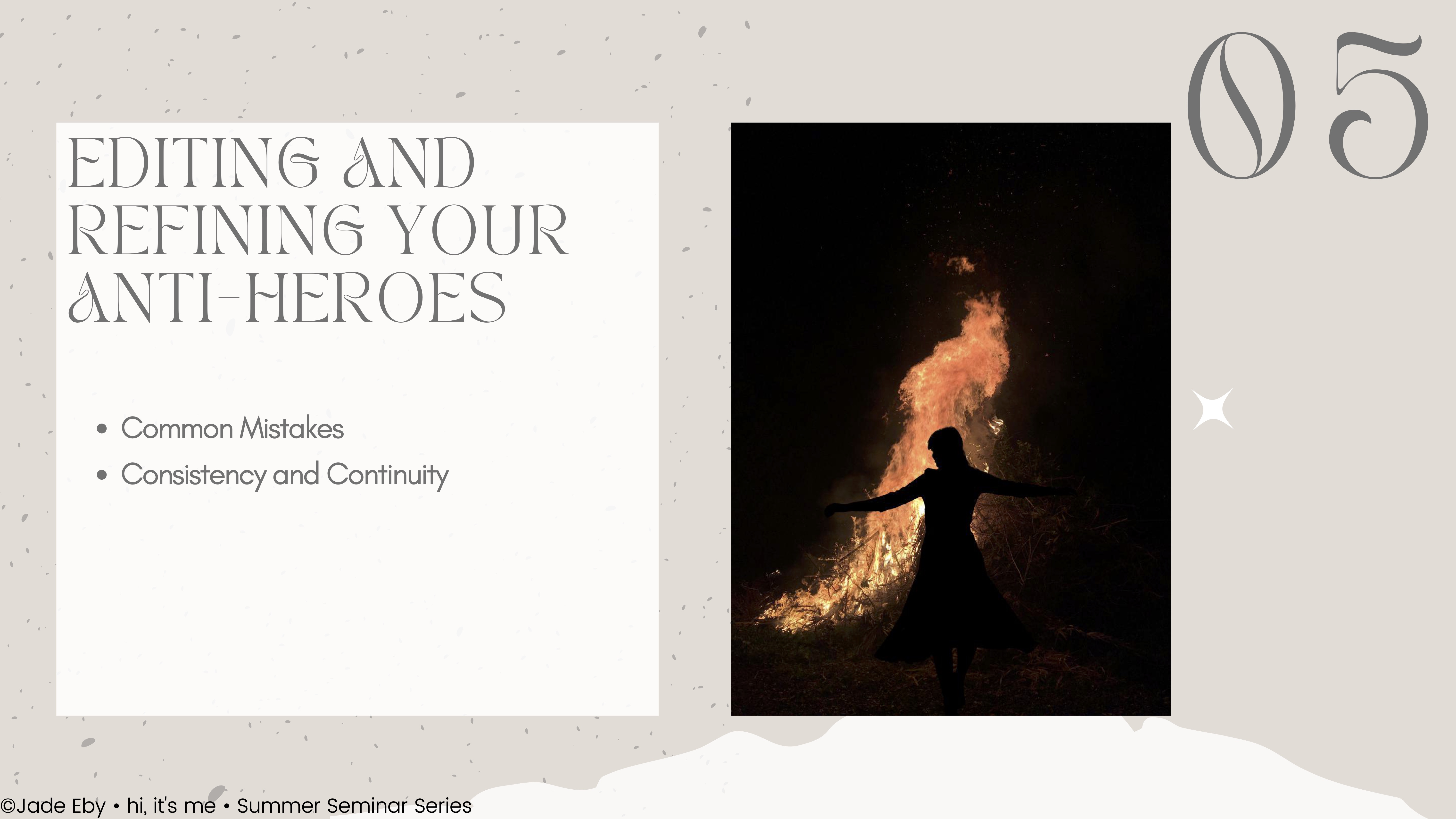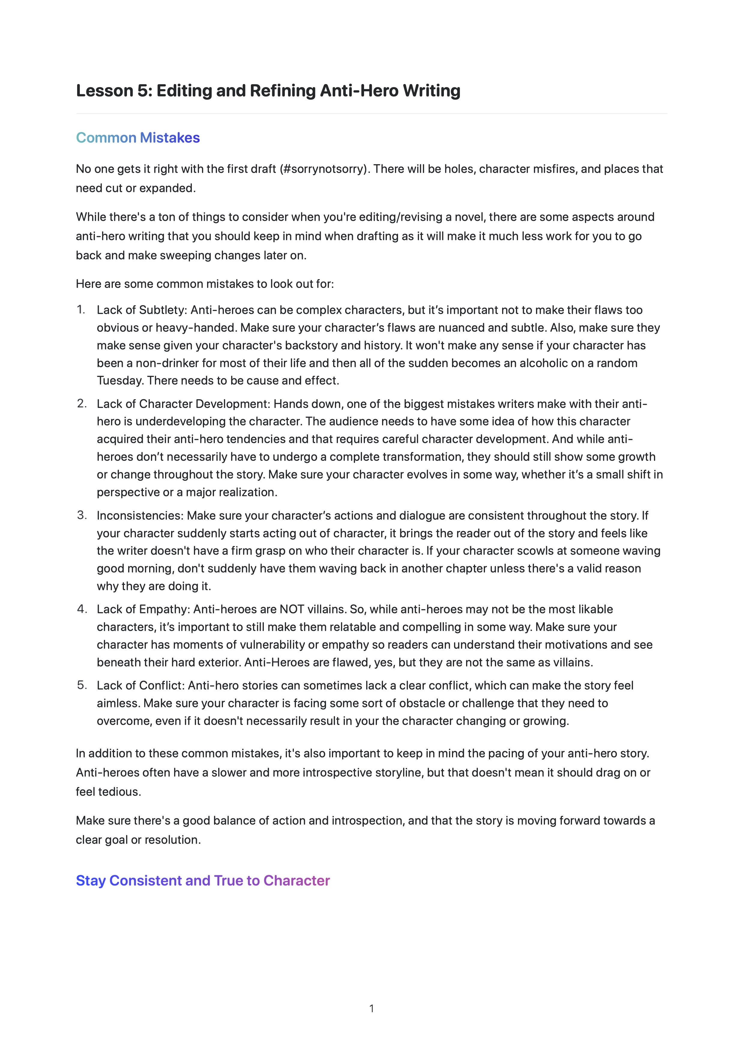 Lesson 5 Editing and Refining Anti-Hero Writing In our final lesson, we'll dive into identifying and fixing common mistakes in developing anti-heroes as well as ensuring consistency of character traits and storyline. DOWNLOAD THE SLIDES DOWNLOAD THE HANDOUTS I have completed this lesson Next Lesson